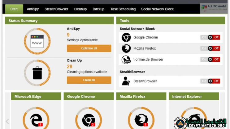 وتضمن وظيفة “عدم التعقب” الآن أن المواقع لا تجمع بيانات المستخدم فحسب، بل ولا تنشئ أيضًا ملفات تعريف مستخدم غير إرادية.لا يمكن لمستخدمي الكمبيوتر تعطيل العديد من ميزات التجسس في متصفحات الويب الشائعة – حتى الخبراء لا يمكنهم إيقاف تشغيلها جميعًا. يجعل AntiBrowserSpy التحكم في جميع إعدادات المتصفح أمرًا سهلاً للغاية. بنقرة واحدة على الماوس، يمكنك تكوين إعدادات جميع متصفحاتك وتعطيل حتى ميزات التجسس المخفية.