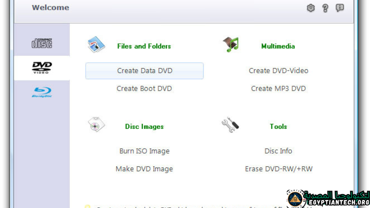 برنامج BurnAware Professional يأتي البرنامج بواجهة سهلة الاستخدام تتكون من أربع قوائم, من خلال القائمة الأولى يمكنك نسخ الملفات والبيانات وإنشاء نسخ الويندوز. من خلال القائمة الثانية يمكنك نسخ ملفات الوسائط المتعددة للصوت والفيديو، أما من خلال القائمة الثالثة يمكنك نسخ الصور وضغط الملفات. تتيح لك القائمة الرابعة والأخيرة مسح الملفات التي قمت بنسخها.