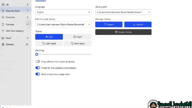 يتيح لك Icecream EPUB Reader أيضًا تنظيم كتبك الإلكترونية في مكتبات وبالتالي تحسين تجربة القراءة لديك. بالإضافة إلى ذلك، يمكنك عرض الكتب في وضعي Book Shelf أو Table View والتحقق من الكتب التي تمت قراءتها مؤخرًا والمفضلة وجميع الكتب بالإضافة إلى تصفيتها حسب التنسيقات. البرنامج يجعل عملية القراءة مريحة لما له من مميزات خاصة.