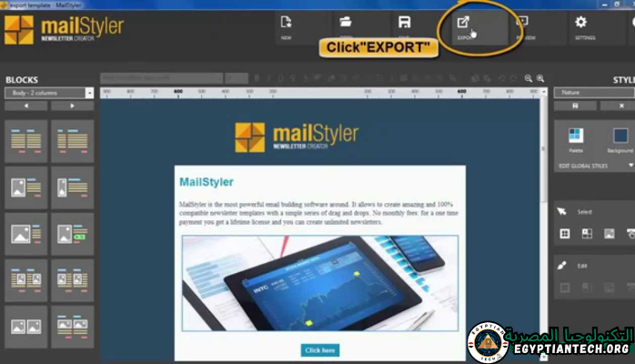 عند إدخال نص مكتوب، يمكنك تحديد الخط واللون والحجم والمحاذاة والنمط المفضل، بالإضافة إلى تطبيق الارتباطات التشعبية. من لوحة “الأنماط”، يمكنك تعديل تفضيلات مظهر “الكتلة” و”الخلايا” و”الرأس” و”التذييل” و”النص الأساسي” و”العنوان” و”الصورة” و”الزر” بشكل كامل. عند الانتهاء، يمكنك معاينة النشرة الإخبارية أو حفظ الملف على جهاز الكمبيوتر الخاص بك. وبالمثل، يمكن تصديره إلى تنسيق EML أو HTML، إما عن طريق تحميله على السحابة أو تخزينه في مجلد محلي.