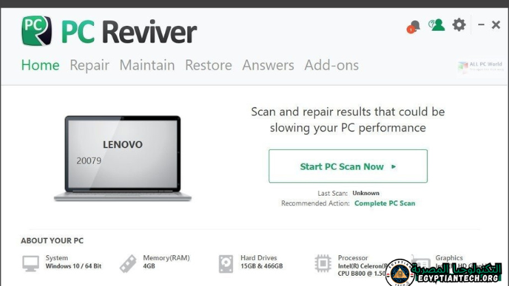 PC Reviver هو أداة متعددة الأغراض تعمل على تشخيص المشكلات التي تواجه جهاز الكمبيوتر لديك وإصلاحها بأمان وتقديم توصيات أخرى للصيانة والتحسين. يعد PC Reviver الطريقة الموثوقة والموصى بها لاستعادة الأداء والاستقرار الأمثل لجهاز الكمبيوتر لديك. احذف العناصر القديمة وغير المستخدمة وغير المرغوب فيها بأمان لتوفير المساحة والذاكرة وتعزيز جهاز الكمبيوتر لديك. علاوة على ذلك، ستتمكن من تعيين تذكيرات وجدولة المهام ليتم تنفيذها تلقائيًا لضمان استمرار جهاز الكمبيوتر لديك في العمل بأفضل أداء.