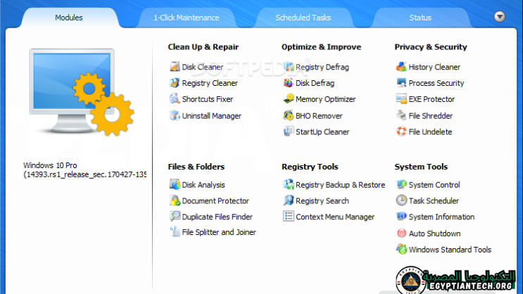 كما أنها تدعم إلغاء تجزئة محركات الأقراص والسجل لتحسين أداء الكمبيوتر واستقراره. يتيح لك منظف بدء التشغيل المدمج التحكم في برامج بدء التشغيل التي يتم تحميلها تلقائيًا مع Windows، والعثور على الملفات المكررة، وإصلاح الاختصارات المعطلة، وإلغاء تثبيت البرامج غير الضرورية. تتضمن الميزات الأخرى الحذف الآمن للملفات، وتمزيق سلة المهملات، وجدولة مهام الصيانة، واستعادة الملفات.